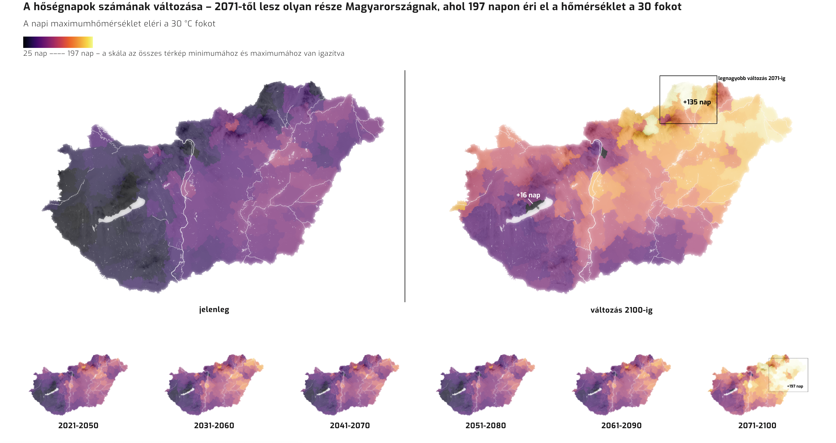 A hőségnapok számának változása – 2071-től lesz olyan része Magyarországnak, ahol 197 napon éri el a hőmérséklet a 30 fokot.
