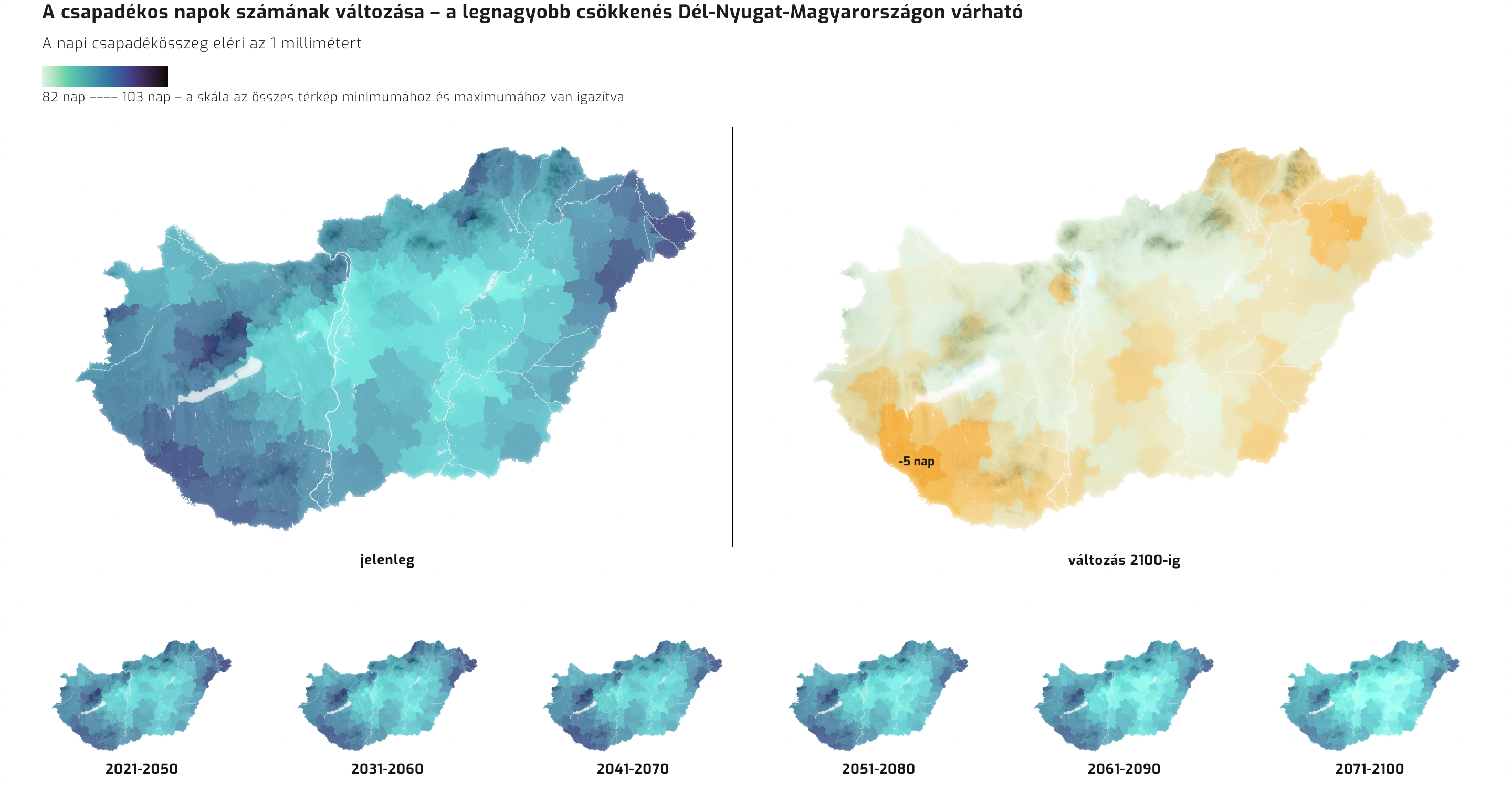 A csapadékos napok számának változása – a legnagyobb csökkenés Dél-Nyugat-Magyarországon várható.