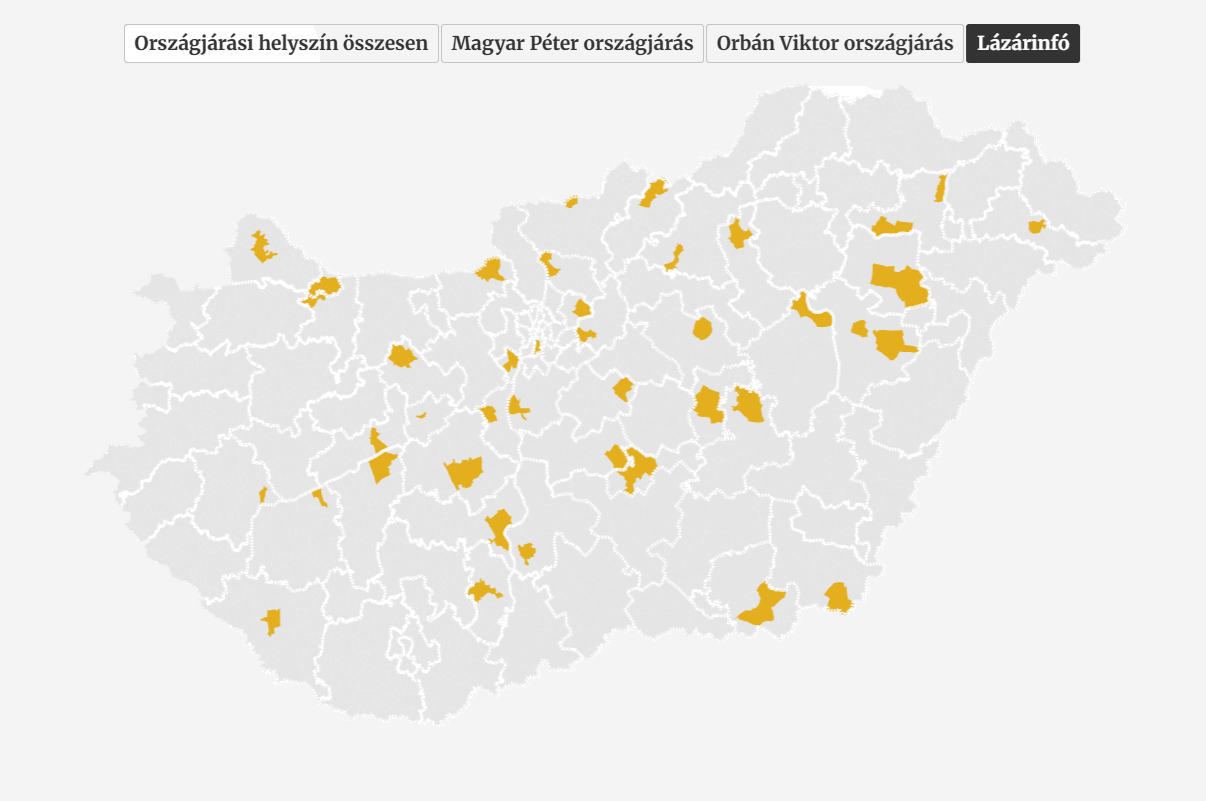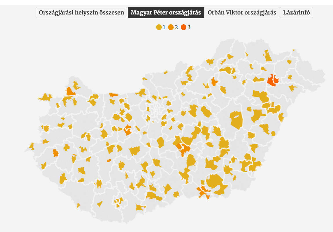 Tavaly írtunk róla, hogy Magyar Péter tavalyi országjárásán számos olyan településre és választókerületbe ellátogatott, ahol korábban a Fidesz fölénye megingathatatlannak tűnt. A Tisza Párt elnöke az elmúlt év nagy részét kampánykörúton töltötte, míg Orbán Viktor csak később, novemberben kezdte el a személyes kampányolást. Ezelőtt a Fidesz vezető politikusai közül csak Lázár János járta rendszeresen az országot, bár a Lázárinfók száma elmaradt a Magyar Péter-féle országjárás állomásaitól.