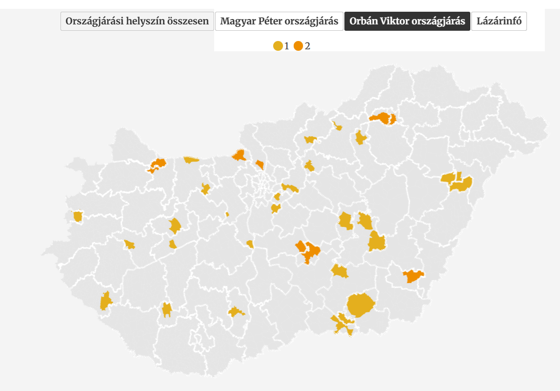 Az országjárás hivatalos, előre bejelentett állomásai mellett a miniszterelnök több kisebb közönség előtt tartott, zártkörű rendezvényen is részt vett, térképünkön ezeket is jelöltük.