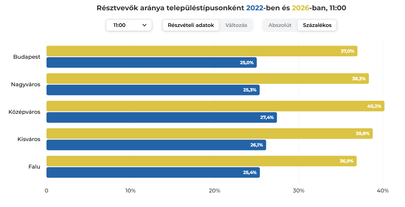 Az eddig szavazó emberek kicsivel több, mint harmada faluban szavazott, de arányuk az összes szavazón belül fél százalékponttal csökkent 2022-höz képest, míg a budapesti és nagyvárosi szavazók aránya a 11 órás adatokban 0,28, illetve 0,24 százalékponttal nőtt.