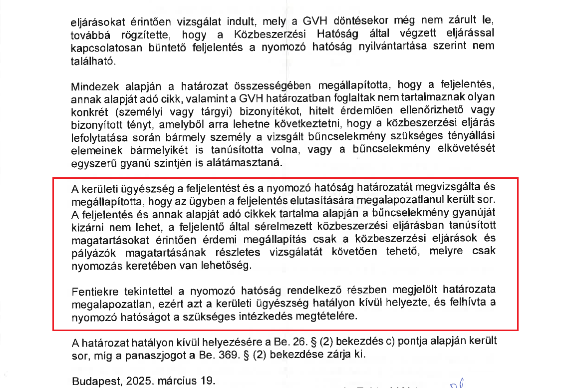 Az ügyészség megvizsgálta a feljelentést és a nyomozó hatóság határozatát is, és arra jutott, hogy az ügyben a feljelentés elutasítása megalapozatlan volt. Megítélésük szerint ugyanis nem lehet kizárni a bűncselekmények gyanúját. Érdemi megállapítást pedig csak azután lehetne tenni, hogy megvizsgálták a pályázók magatartását és a közbeszerzési eljárásokat. Ehhez pedig nyomozásra van szükség.