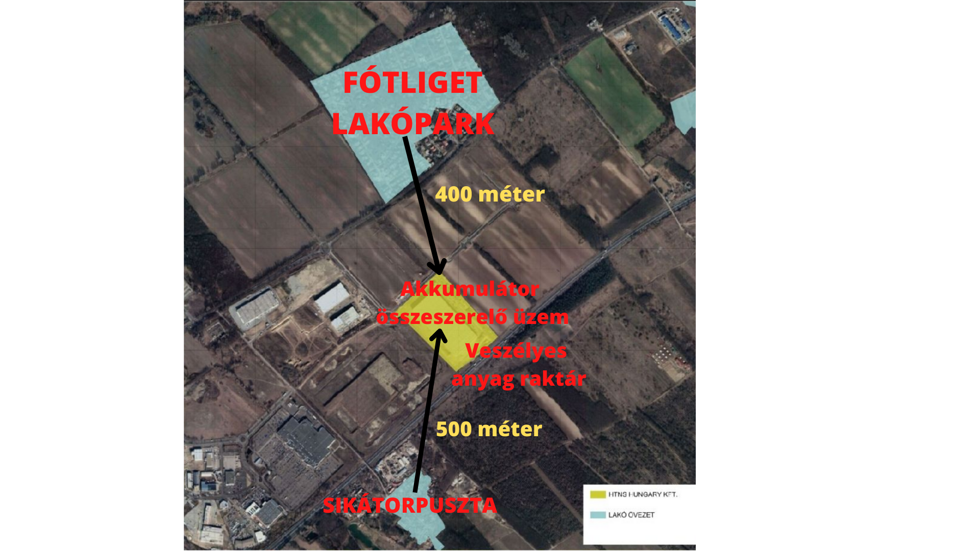 A BYD Kft. akkumulátor-összeszerelő üzeme és a HTNS Kft. veszélyes anyag raktára a HelloParks Fót nevű ipari parkban; a két üzem ugyanabban a raktárcsarnokban, a lakóházaktól 4-500 méterre létesülne. (Fotó: Google Maps alapján)