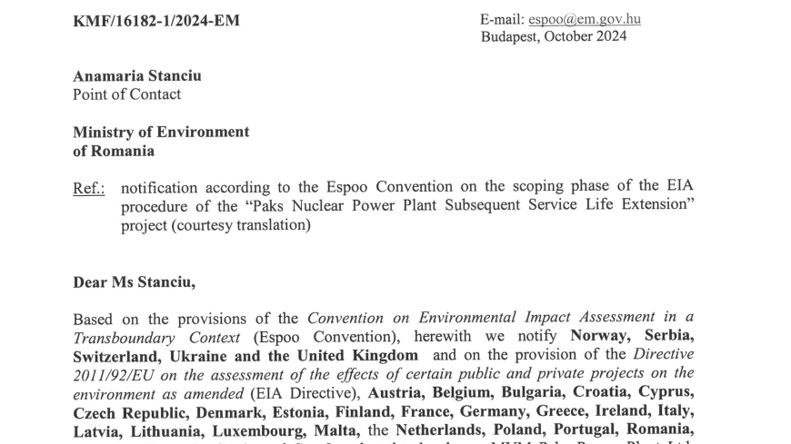 Az Energiaügyi Minisztérium az Átlátszó megkeresésére arról tájékoztatott, hogy az értesítés meg is történt, bővebbet azonban nem árultak el. A román környezetvédelmi minisztérium honlapjáról azonban le lehet vadászni a kiküldött értesítést.