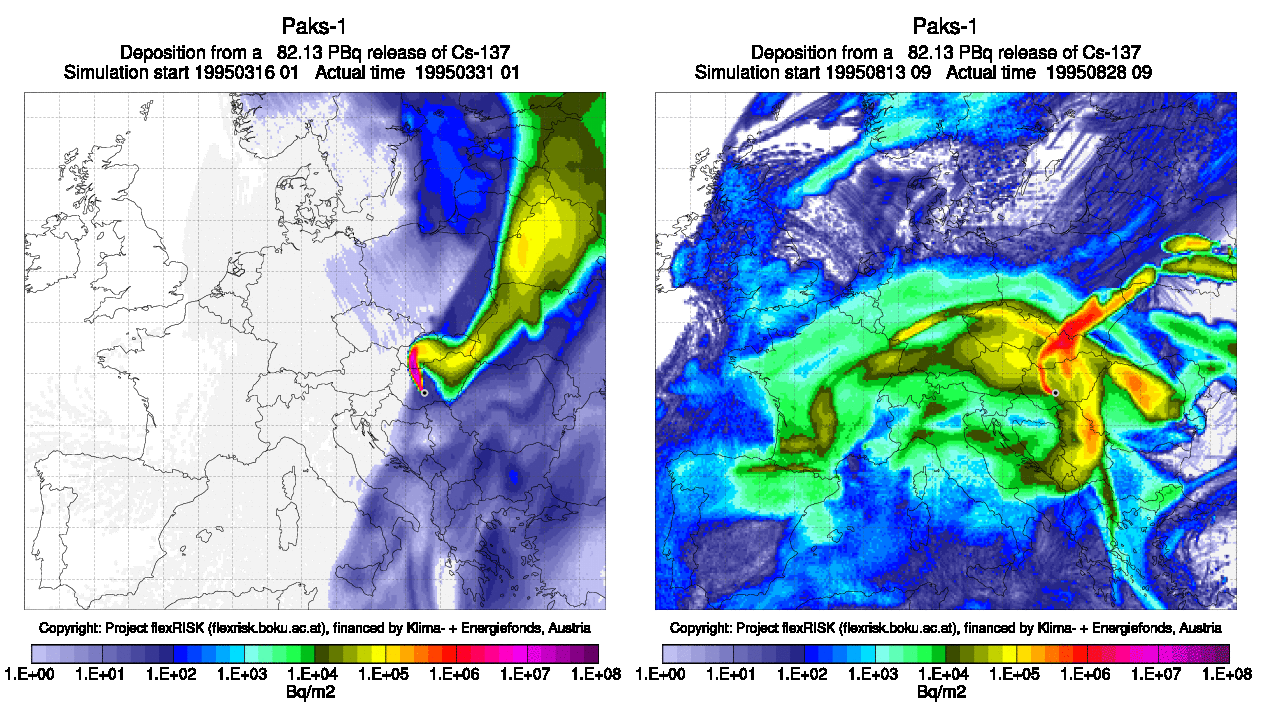 Ha például egy olyan napon következne be katasztrófa a Paksi Atomerőműben, mint amilyen 1995. március 16-a volt, akkor kelet felé terülne szét a radioaktív szennyeződés. Az 1995. augusztus 13-ára jellemző időjárási viszonyok esetén viszont a baleset során kiszabaduló radioaktív szennyeződés egész Európát érintené. (Minél pirosabb a szín a térképen, annál erősebb a radioaktivitás.)