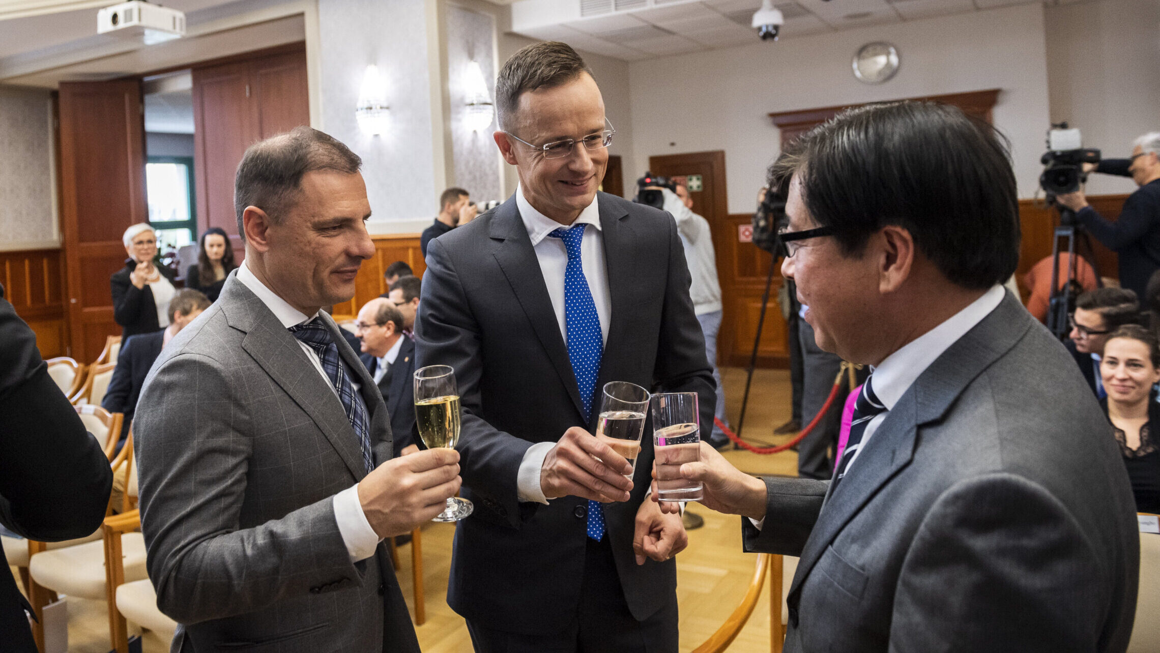 Tuzson Bence fideszes országgyűlési képviselő, Szijjártó Péter külgazdasági és külügyminiszter és Kim Vu Csan, a Samsung SDI Magyarország Zrt. gyártóközpontjának vezetője (b-j) a minisztériumban tartott sajtótájékoztató után 2019. október 10-én. (Fotó: MTI/Mónus Márton)