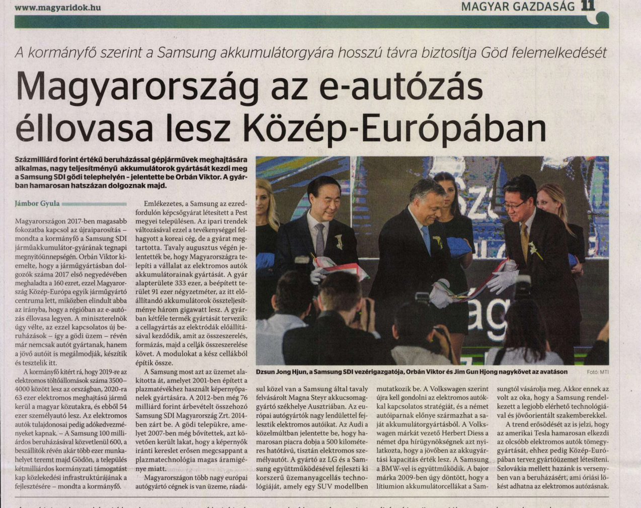 A cikk elkészítéséhez az archív anyagokat az Arcanum adatbázisa szolgáltatta. Címlapkép: Orbán Viktor miniszterelnök (k), Dzsun Jong Hjun, a Samsung SDI vezérigazgatója (b) és Jim Gun Hjong dél-koreai nagykövet átvágja a nemzetiszínű szalagot a Samsung SDI gödi elektromos jármű akkumulátor gyárának nyitóünnepségén 2017. május 29-én. (Fotó: MTI/Szigetváry Zsolt)