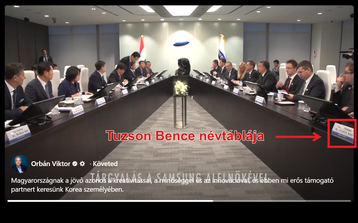 Ráadásul Tuzson nem csak simán a delegáció egy másodvonalas tagja volt a miniszterelnök Facebook-galériája szerint, hanem Orbán Viktor közvetlen közelében sétált egy dél-koreai fontosságokkal tartott tárgyalásra, ahol az asztalnál is helyet kapott Orbán mellett hárommal. A miniszterelnök Facebook-oldalára feltöltött szöuli videóban pedig benne van a samsungos találkozó is, és bár ott Tuzson nem látszik, a névtáblája jól kivehető (1:40-nél), tehát ő is ott ült a megbeszélésen.