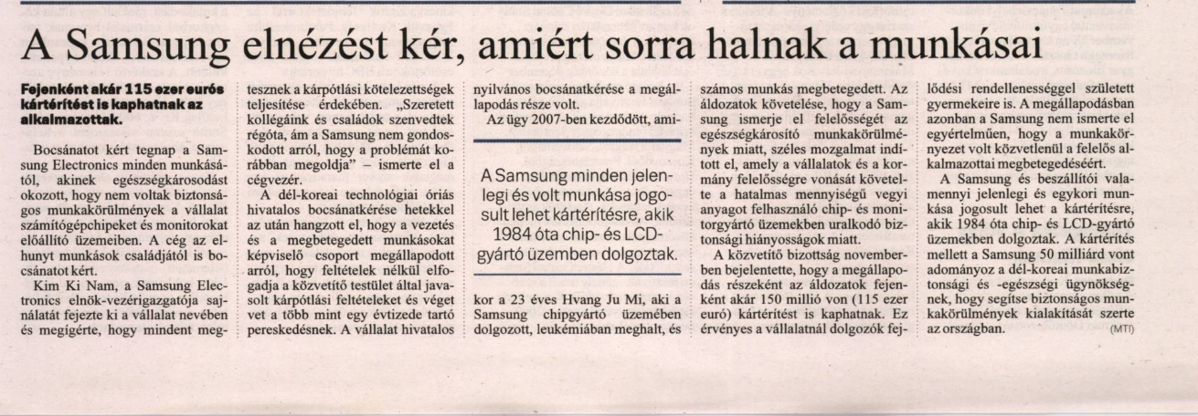 a Samsung semmit nem tett a problémák megszüntetéséért, és próbálja eltitkolni a dolgozók mérgezését.