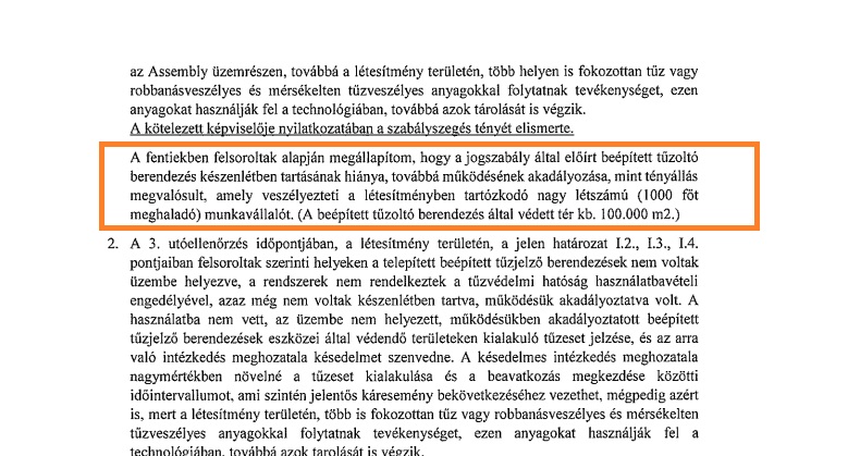 Az irat leszögezi, hogy a tűzjelző és tűzvédelmi berendezések hiánya és a működésük akadályoztatása „jelentős káreseményhez vezethet”, mert „a létesítmény területén mérsékelten és fokozottan tűz- és robbanásveszélyes anyagokkal folytatnak tevékenységet”.
