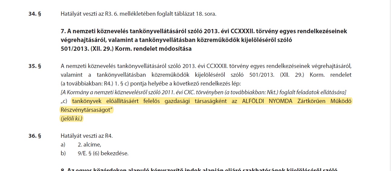 a tankönyvek előállításáért felelős gazdasági társaságként az Alföldi Nyomda Zrt.-t jelölte ki az állam.