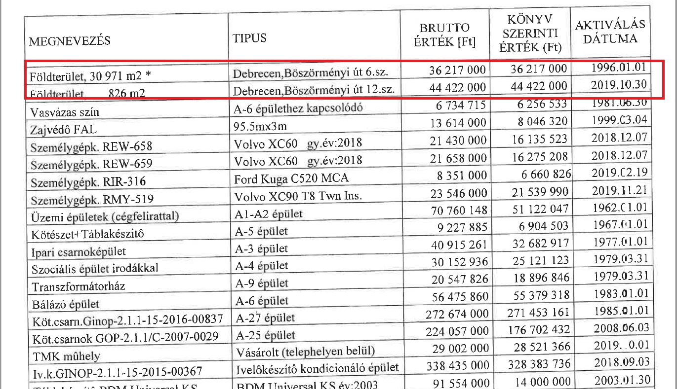 A debreceni telkek könyvelés szerinti árát tüntetik fel a kiperelt megállapodásban (a 49. oldalon). A háromhektáros (30 971 négyzetméter) Böszörményi út 6. szám alatti teleknél 36,2 millió forint szerepel. Azonban azt csillagozással jelölik, hogy a valós piaci érték ennek a sokszorosa. A Böszörményi út 12. szám alatti, 862 négyzetméteres teleknél 44,4 millió forint áll a táblázatban.