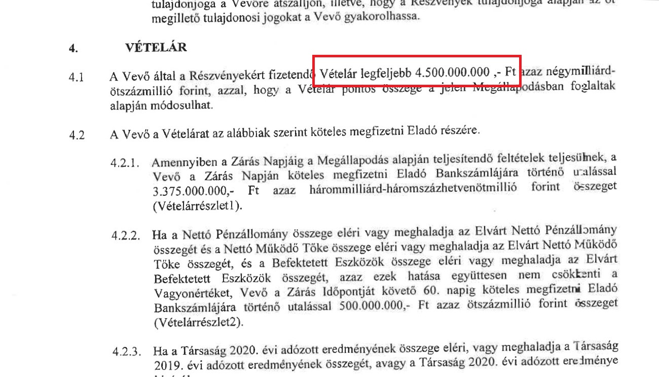 Az utolsó részlet kifizetését például attól tették függővé, hogy a társaság 2020-as adózott eredményének az összege eléri-e a 2019-est. A 625 millió forintot ennek fényében fizették meg 2021. június végéig.