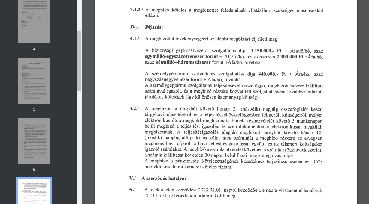 A „biztonsági gépkocsivezetői szolgáltatás” díja nettó 1 150 000 forint/fő havonta, az autót pedig havi nettó 440 ezer forintért bérlik, és az üzemanyagot is a hatóság fizeti.