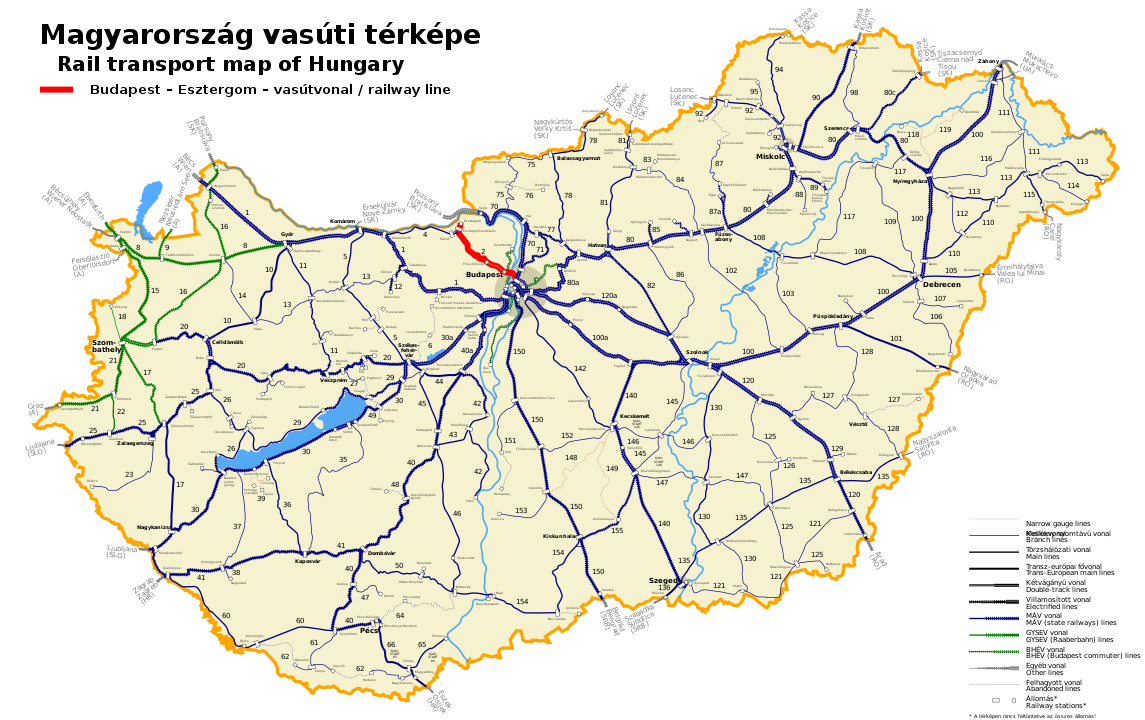 Budapest–Esztergom-vasútvonal nyomvonala a magyarországi vasúthálózatban (Wikipedia/JolietJake)