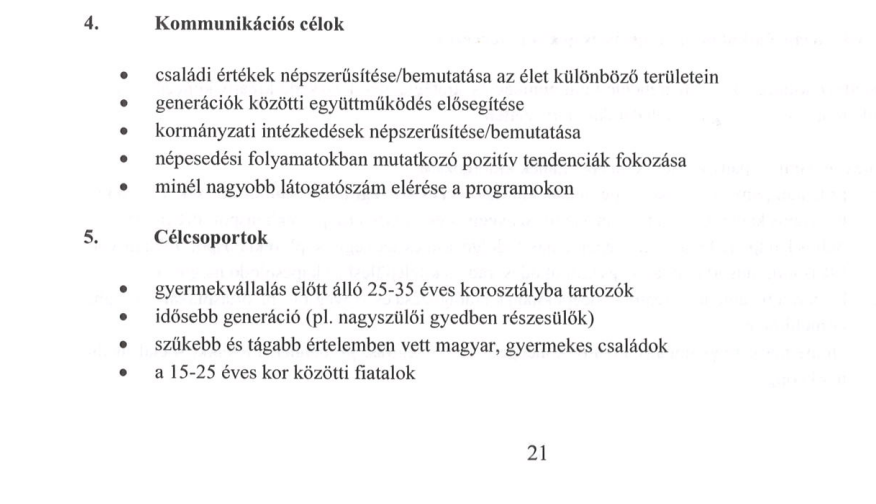 A dokumentumhoz csatolt műszaki leírás szerint ebből az összegből reklámkampányokkal és rendezvényeken népszerűsítik a családi értékeket és a kormányzati intézkedéseket a gyermektelen fiatalok, a gyermekes családok és az idősek körében.