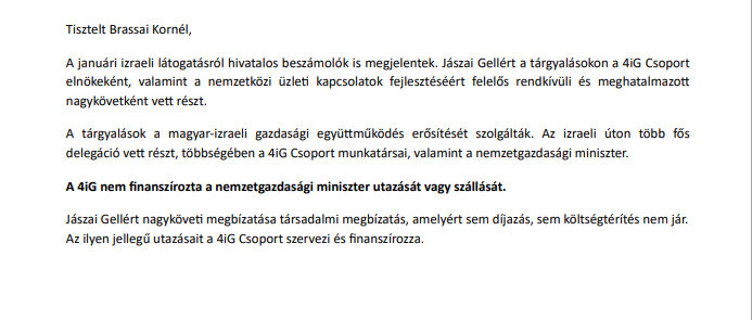 Megkerestük a 4iG-csoport sajtóosztályát is az utazással kapcsolatban. Kérdéseinkre Elkán Péter, a cégcsoport kommunikációs vezetője válaszolt. Nyilatkozata szerint Nagy Márton miniszter utazását és szállását nem a 4iG-csoport finanszírozta, ellenben Jászai Gellért és a többi kollégája költségeit igen.