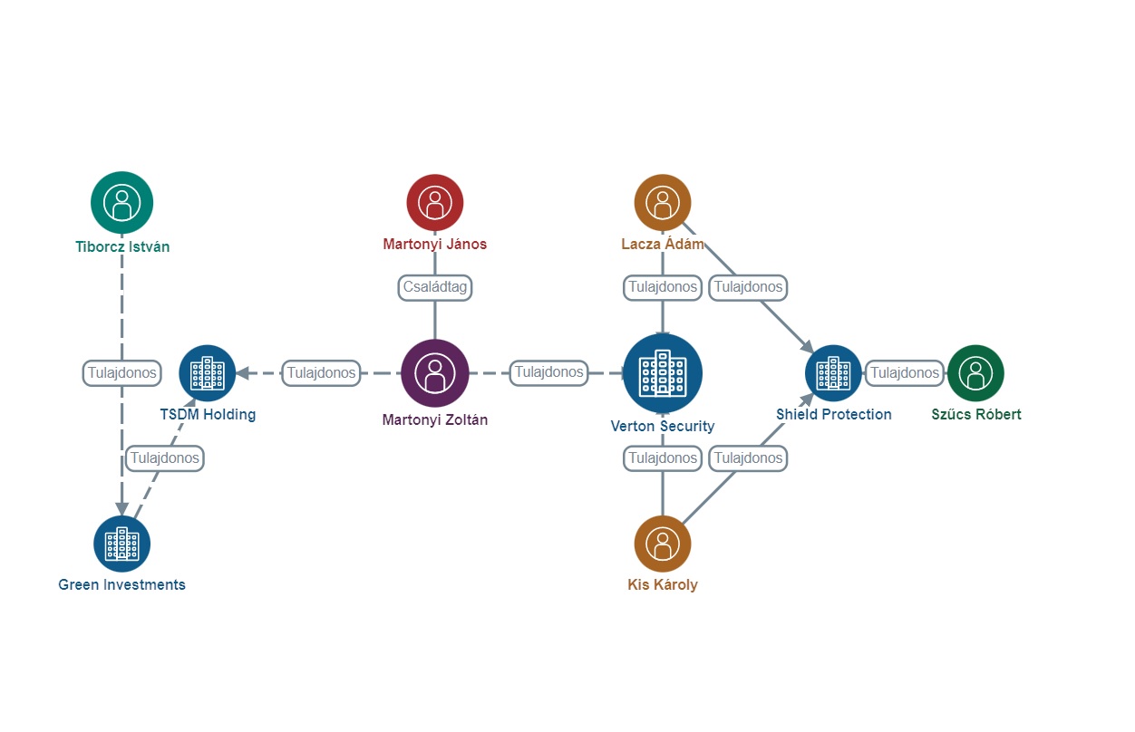 A cég ugyanakkor a NER-hez is könnyen beköthető, dr. Martonyi Zoltánon, Martonyi János fián keresztül. A SHIELD PROTECTION tulajdonosai közül kettő, Lacza Ádám és Kis Károly a Verton Security kft.-n keresztül kötődnek Martonyi Zoltánhoz. A Vertonban dr. Martonyi Zoltán tulajdonos volt 2012 és 2017 között, Lacza Ádám szintén tulajdonos 2012-től, Kis Károly pedig 2012-től ügyvezető és 2017-től tulajdonos. Martonyi Zoltán pedig a mostanra felszámolt TSDM holding tulajdonosa volt 2013-17-ben, ennek szintén tulaja volt a Green Investments 2013–15 között, a Greenben pedig ügyvezető és tulajdonos volt Tiborcz István 2014 és 2015 között.