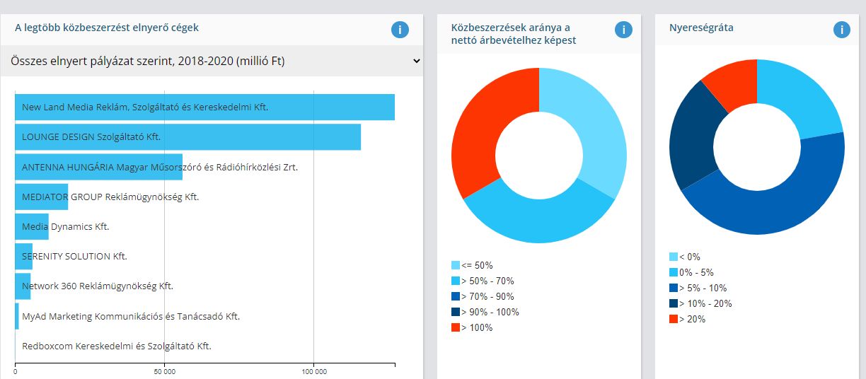 A Transparency International napokban publikált interaktív oldalán, a Tenderbajnokon ezt szépen mutatja is a grafikon. A képen azt látjuk, hogy a Nemzeti Kommunikációs Hivatal által kiírt közbeszerzések többségét a Balásy-féle New Land Media Kft. és a Lounge Design Kft. kapja.
