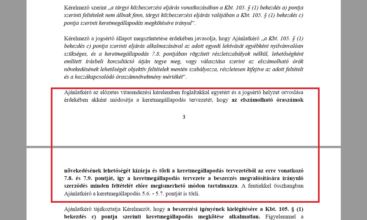 A pályázó emellett két további jogsértő részletre is (ld.: elszámolható óraszámok növekedése és az építési beruházások becsült értékére vonatkozóan előírt korlátozó rendelkezés) felhívta a figyelmet, amelyeket a kiíró Miniszterelnökség aztán módosított/törölt is, elismerve a jogsértést.