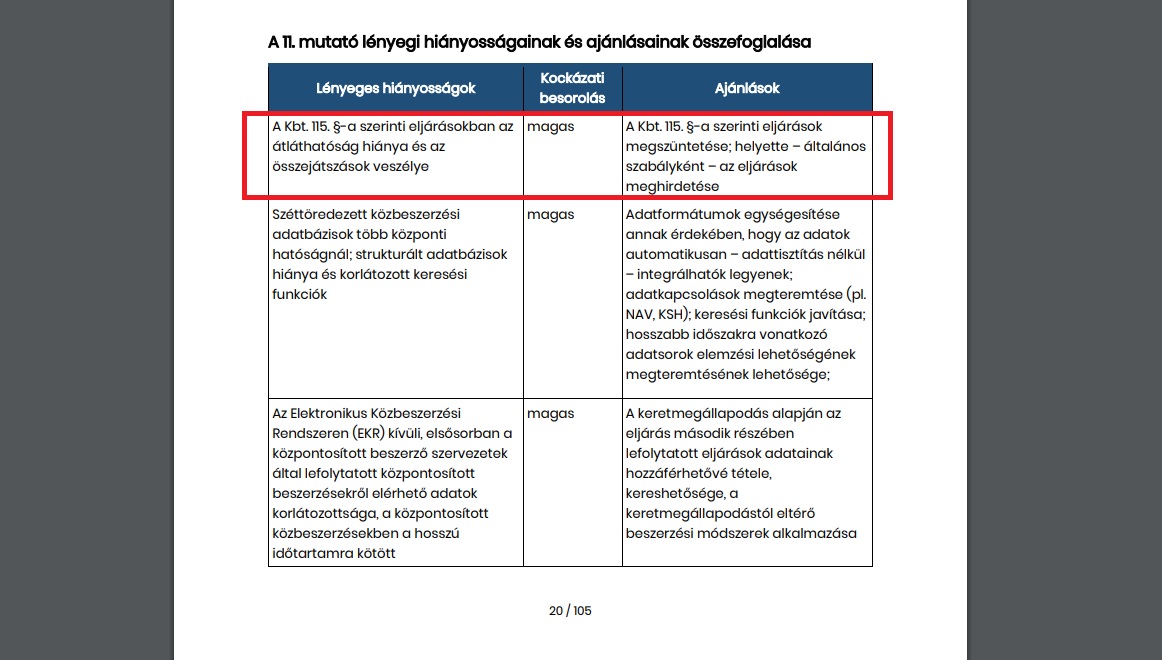 Az EU kérésére 2022-ben felállított Integritás Hatóság első, a magyar közbeszerzési rendszerre vonatkozó integritáskockázat-értékelési jelentésében pedig a következő megállapítás szerepel a 115-ös eljárással kapcsolatban: