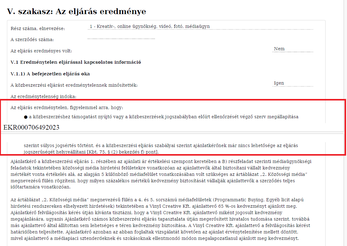 Az ellenőrök (az irányító hatóság vagy a Miniszterelnökség Közbeszerzési Felügyeleti Főosztálya) viszont úgy ítélték meg, hogy a Vinyl Creative Kft. ajánlattevő érvénytelenné nyilvánítása nem volt jogszerű, tekintettel arra, hogy „a közbeszerzési dokumentáció a kérdéses médiafelületeken nem zárta ki a 0%-tól eltérő megajánlás lehetőségét.” Így annak ellenére, hogy kommunikációs szakmai szempontok alapján valóban nem lehetséges a kedvezmény megajánlása, „a közbeszerzési dokumentáció nem volt kellően egyértelmű a tekintetben, hogy a kérdéses médiafelületeken milyen megajánlás jelent érvényes, illetve milyen megajánlás jelent érvénytelen ajánlatot” – áll az indoklásban.