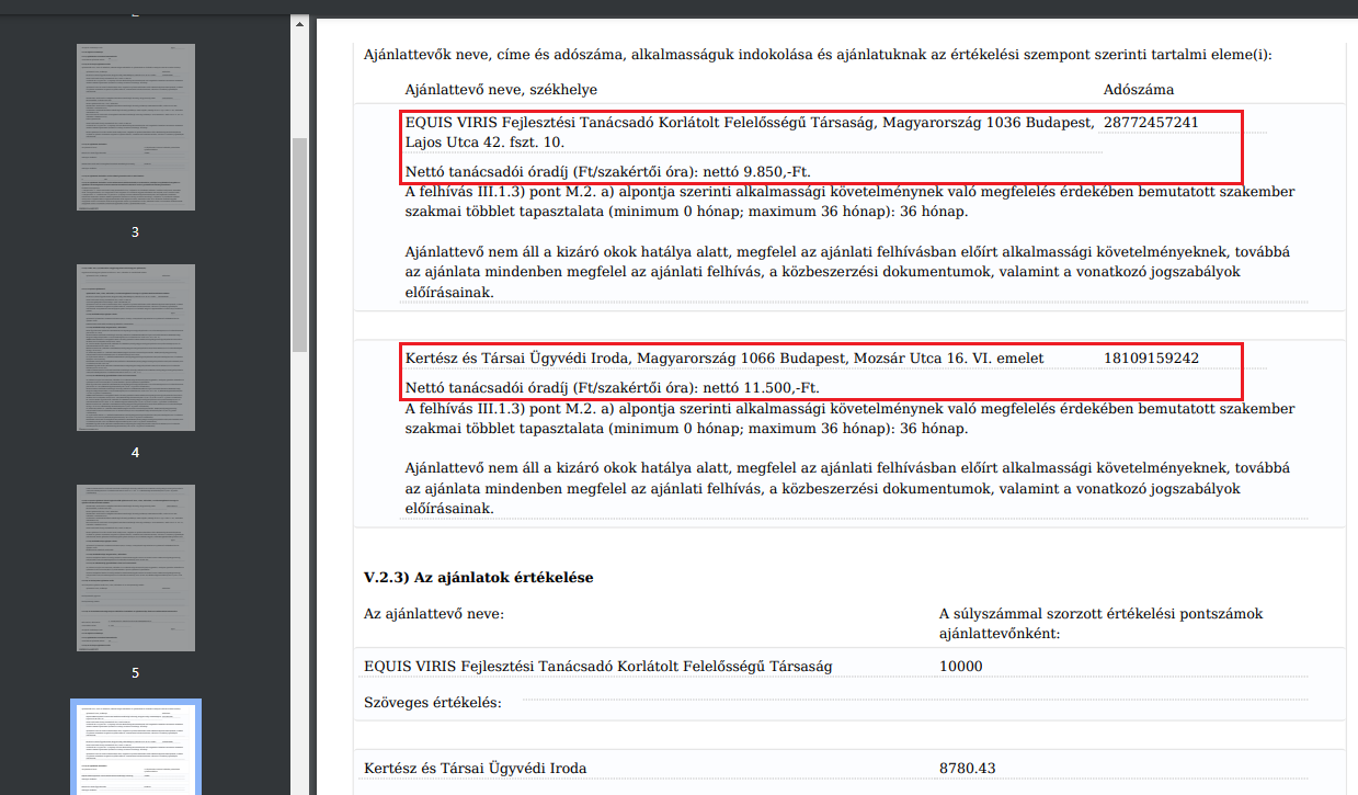 Az EQUIS VIRIS Kft. így összesen 350 millió forint értékű megbízást nyert el. És bár mindegyik részre számos ajánlat érkezett (tehát nagy volt a verseny), mind a négy esetben a Kertész és Társai Ügyvédi Iroda tette a második legolcsóbb ajánlatot.