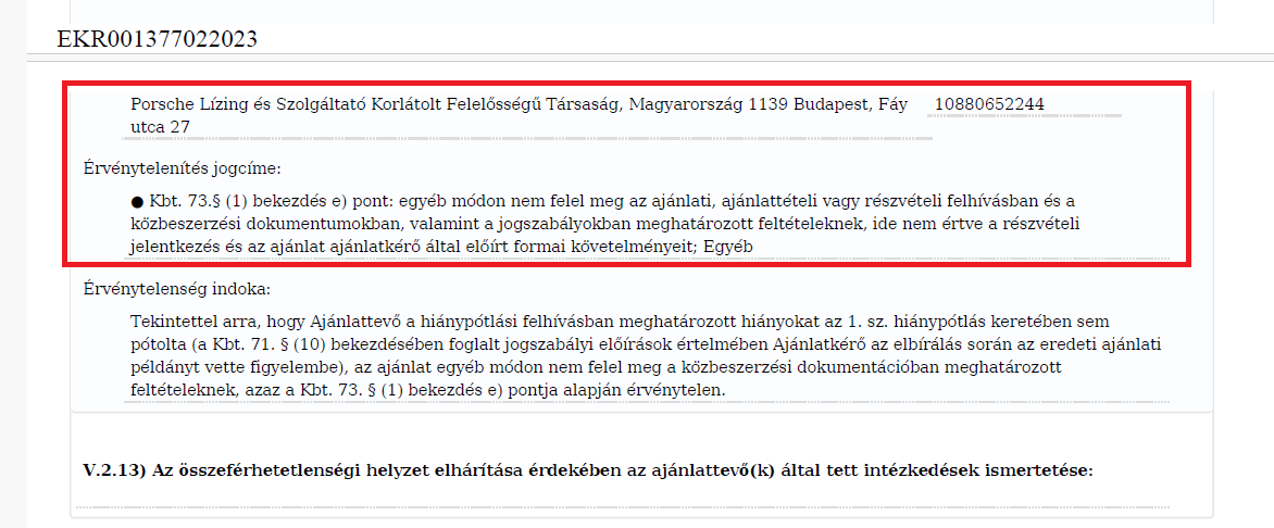 A Porsche ezután a hiánypótlást sem nyújtotta be a felmerült kérdésekkel kapcsolatban, ezért az ajánlatát érvénytelennek nyilvánították a Kbt. 73. § (1) bekezdés e) pontja alapján.