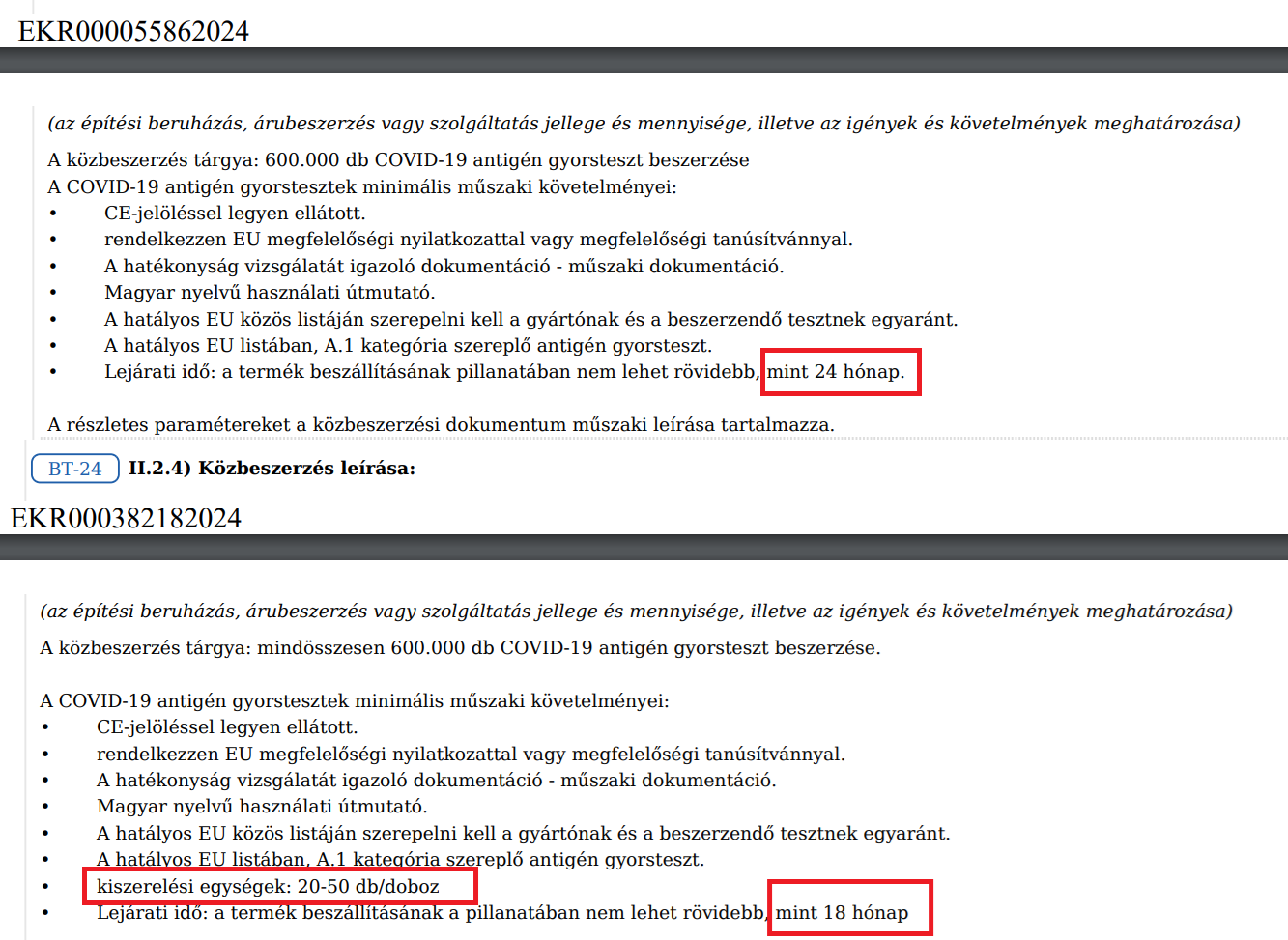 Míg ez első felhívásban nem határozták meg a kiszerelési egységeket, addig a másodikban már igen (20-50 db/doboz), viszont a lejárati határidő tekintetében engedékenyebb lett az OKFŐ. Az ajánlattevőnek már nem kell a 24, elég a minimum 18 hónapos szavatosságot garantálniuk.