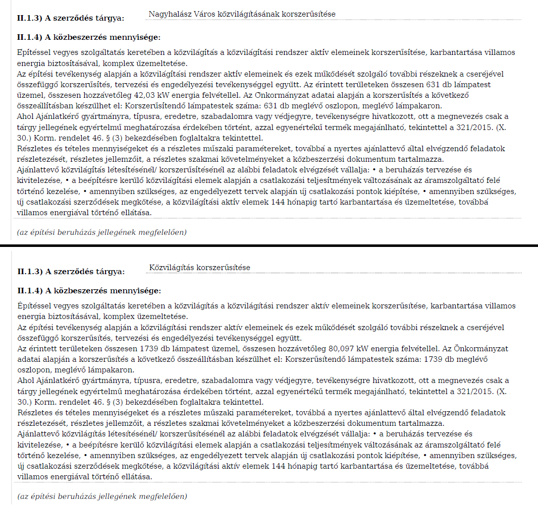 De nem csak a cégek voltak azonosak a vizsgált tendereknél. Az egri közbeszerzési eljárás felhívásának szövege így nézett ki: