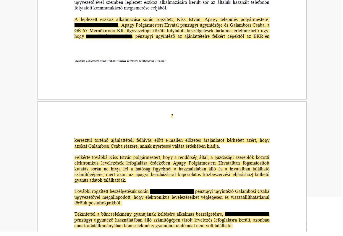 Arra, hogy ezek az információk hogyan juthattak el a cégekhez, van utalás a rendőrség határozatában is. A hatóság ugyanis lehallgatott telefonokat – így például Apagy település polgármestere, a polgármesteri hivatal pénzügyi ügyintézője és Galambosi Csaba, a GÉ-65 Mérnökiroda Kft. ügyvezetője között folytatott beszélgetéseket is rögzítette.