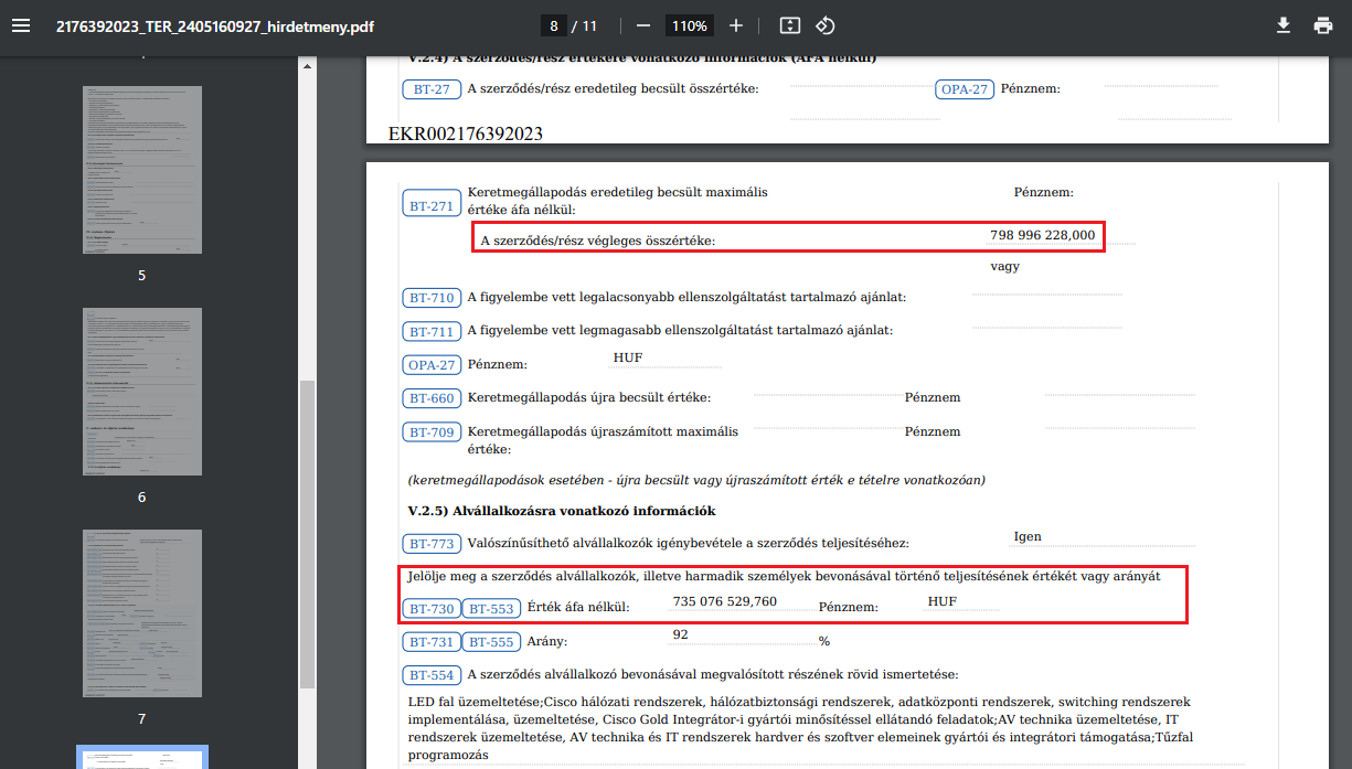 Az A.B.Y.11 Kft.-t pedig a Telekom Rendszerintegráció Zrt., az AV Spring kft., a ComplexIT Gyengeáramú és Informatikai Kft. és a holland NTT Magyarország Kft. támogatta. Az ő szerepük pedig annyira fontos a történetben, hogy a nettó 798,9 millió megbízási díjból nettó 735 millió őket illeti.