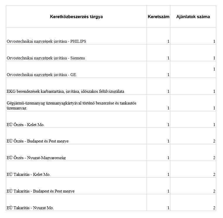 Pedig ennek nem kellene így lennie, tette hozzá. Ha a kórházak egyenként írhatták ki maguknak a tendereiket, akkor mindig sokkal nagyobb volt a verseny. Az Uzsoki Utcai Kórház 2019-es közbeszerzésén például 12 ajánlat érkezett őrzésre, a szombathelyi kórház őrzési feladataira pedig heten jelentkeztek. De nagyon ritka volt a négynél kevesebb beérkezett ajánlat a többi kiírás esetében is, és sokszor bukkantak fel kis helyi szolgáltatók a pályázók között.