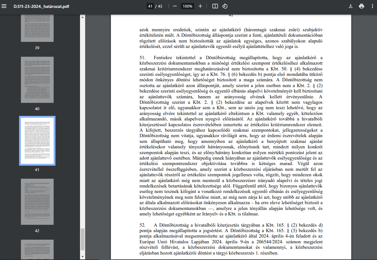 A Közbeszerzési Döntőbizottság ugyanis szintén lefolytatta a saját eljárásait (D.511/23/2024. és D.515/22/2024.), amelyeknek eredményeként megállapította, hogy az ajánlatkérő megsértette a közbeszerzésekről szóló törvény több pontját, ezért a Döntőbizottság megsemmisíti az ajánlatkérő „Európai Unió Hivatalos Lapjában 2024. április 9-én a 206544/2024. számon megjelent részvételi felhívást, a közbeszerzési dokumentumokat és valamennyi, a közbeszerzési eljárásban hozott ajánlatkérői döntést a tárgyi közbeszerzés” 1. és 3. részében is. Emellett az ajánlatkérővel szemben 3, illetve 2 millió forint bírságot szab ki.