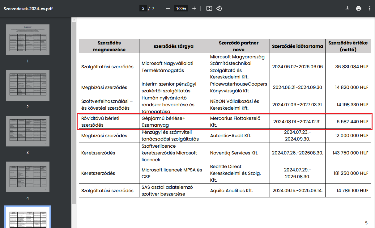 Ami biztos, hogy az Integritás Hatóság 5 millió forintot meghaladó szerződései között jelenleg mindössze egy releváns szerződés szerepel: a Mercarius Flottakezelő Kft.-vel kötöttek rövidtávú bérleti szerződést gépjármű bérlésre és üzemanyagra 6 582 440 forint értében 2024.08.01. és 2024.12.31. között. Hogy ez hány darab és milyen autó bérlését jelenti, nem szerepel a táblázatban.