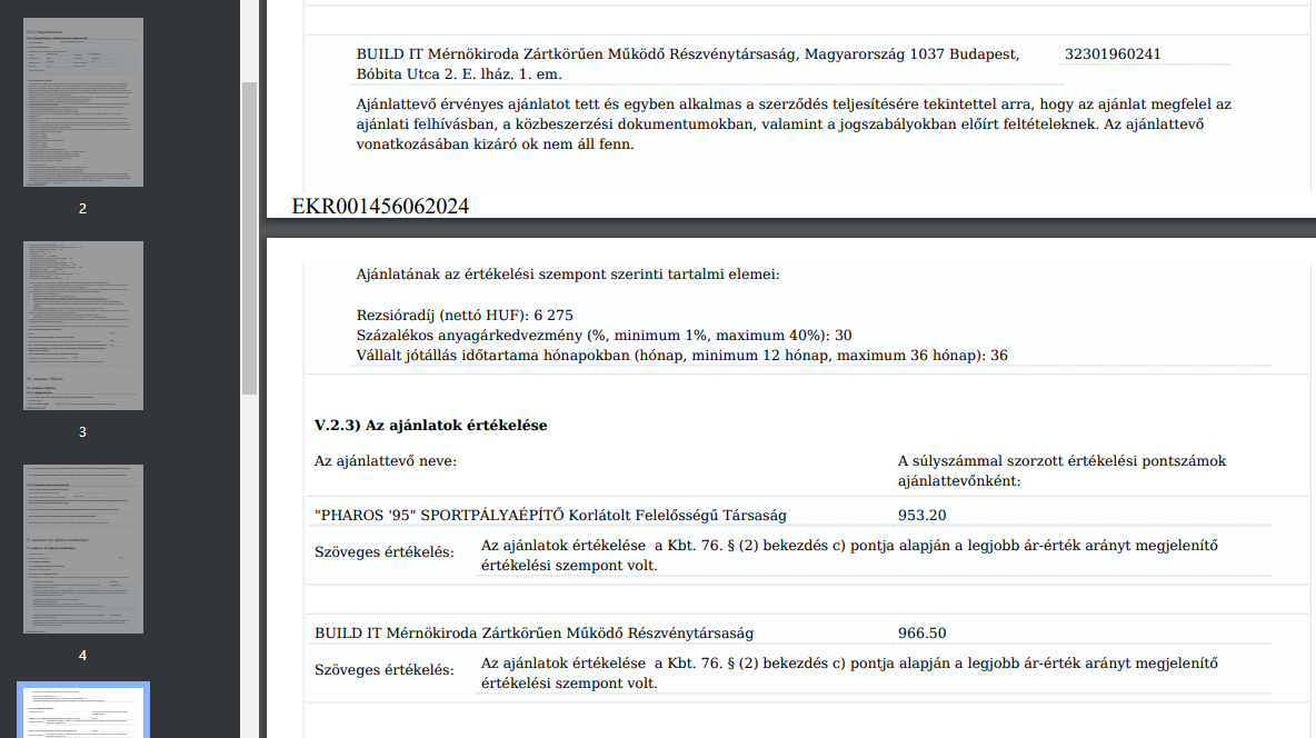 A két érvényes ajánlat közül a Build It bizonyult az olcsóbbnak, de csak azért, mert – bár a rezsióradíjuk magasabb volt, mint a Pharosé –, 30 százalékos anyagárkedvezményt ajánlottak meg a Pharos 23 százalékával szemben.