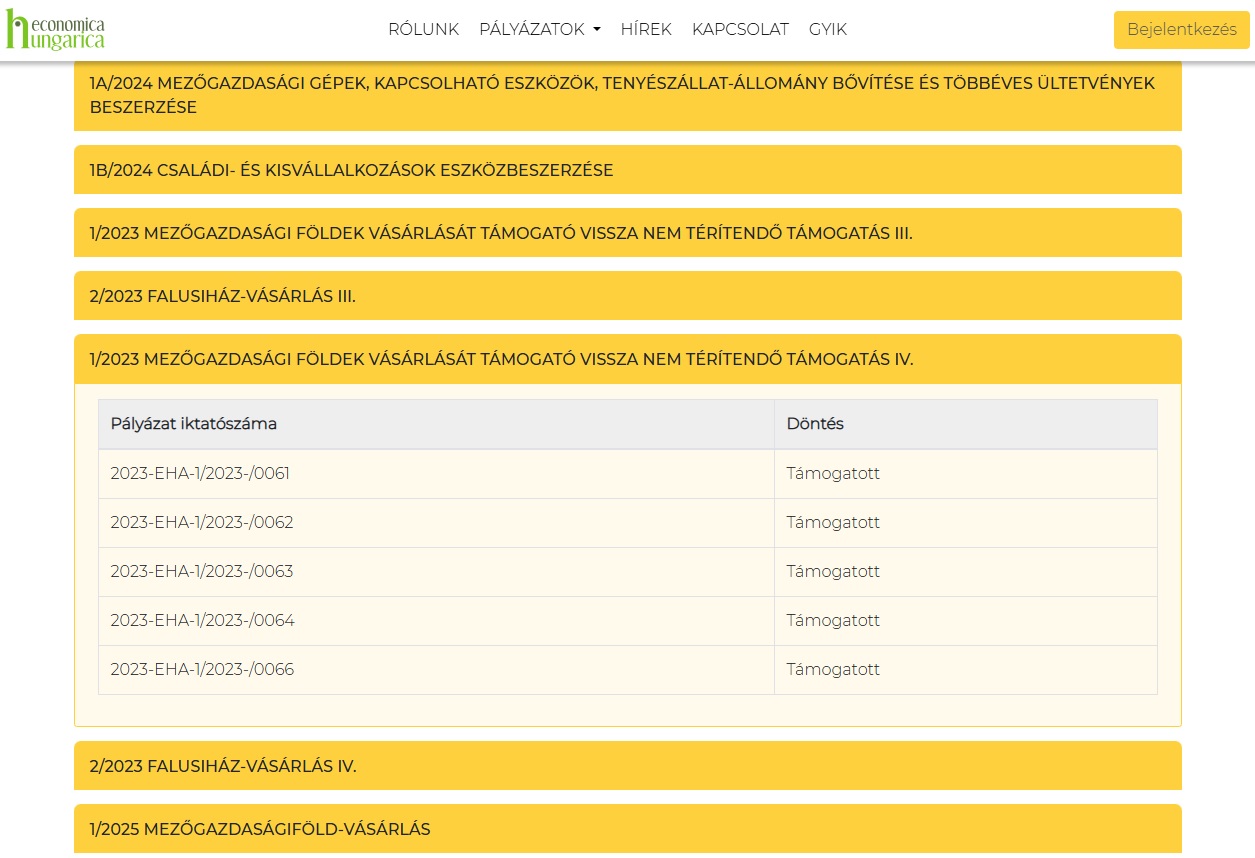 Az elbírált pályázatok listája az alapítvány honlapján