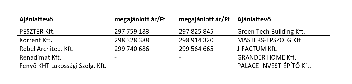 2. A másik eljárás a Gondozóház bővítéses átalakítása, amire a PESZTER Kft. mellett a Green Tech Building Kft. és WEST HUNGÁRIA BAU Építőipari Kft. adott még be ajánlatot. A PESZTER 2,7 milliárd forintos ajánlattal nyert, a Green Tech jóval drágábban, 3,8 milliárdért, míg a WHB 3,6 milliárd forintért vállalta volna a munkát.