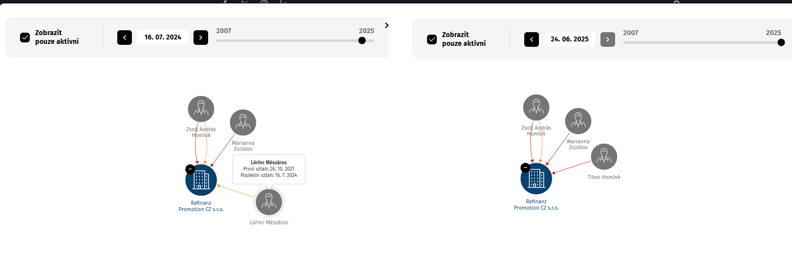 A Rafinanz Promotion CZ s.r.o. kapcsolati hálójának változása 2024 és 2025 között. A kép kattintással nagyítható. Forrás: finmag.cz