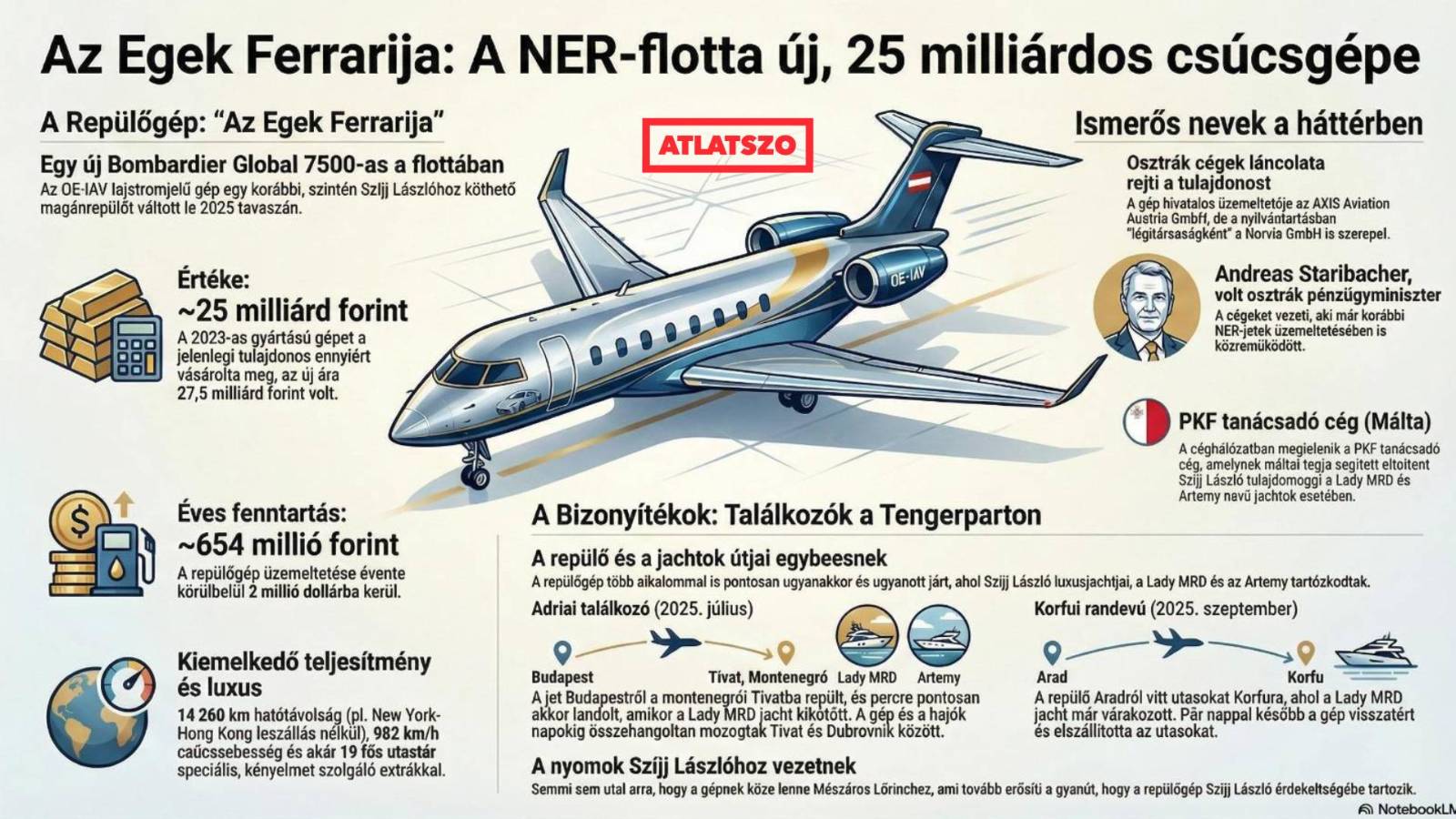 A most felfedezett Bombardier Global 7500-as luxusjet minden jel szerint azt a repülőt váltotta, amivel Szíjj László kormányközeli vállalkozó, a Duna Aszfalt tulajdonosa három éve repült Afrikába. Az a korábbi magángép ugyanis idén március elején elhagyta Magyarországot, a májusban érkezett „utódnak”, pedig bár szintén osztrák a lajstromjele és Bécs a bázisa, az útvonaladatokból egyértelmű a magyar kötődése. A 2023-as gyártású, de csak 2024 áprilisától használatba vett jet akkori értéke 78 millió dollár körül volt, ami 27,5 milliárd forintnak felelt meg. A mostani, második tulajdonos ennél valamennyivel kevesebbért, kb. 25 milliárd forintért juthatott hozzá az OE-IAV lajstromot viselő impozáns magánrepülőhöz idén tavasszal.