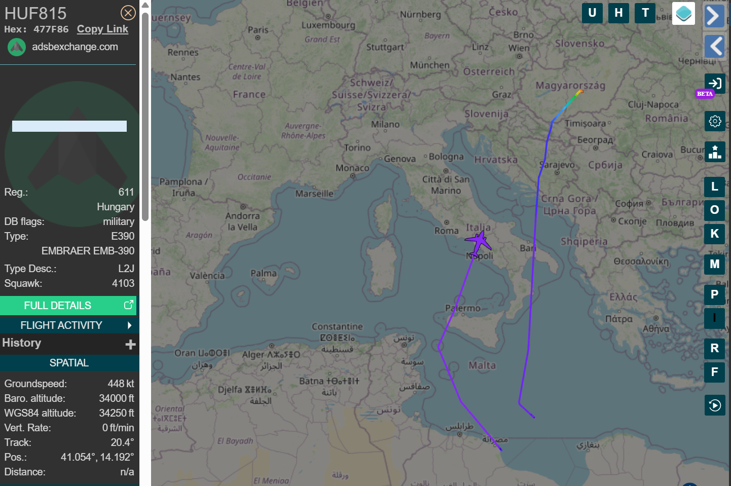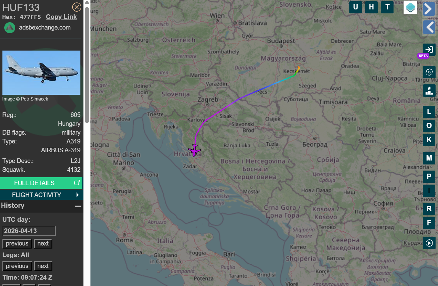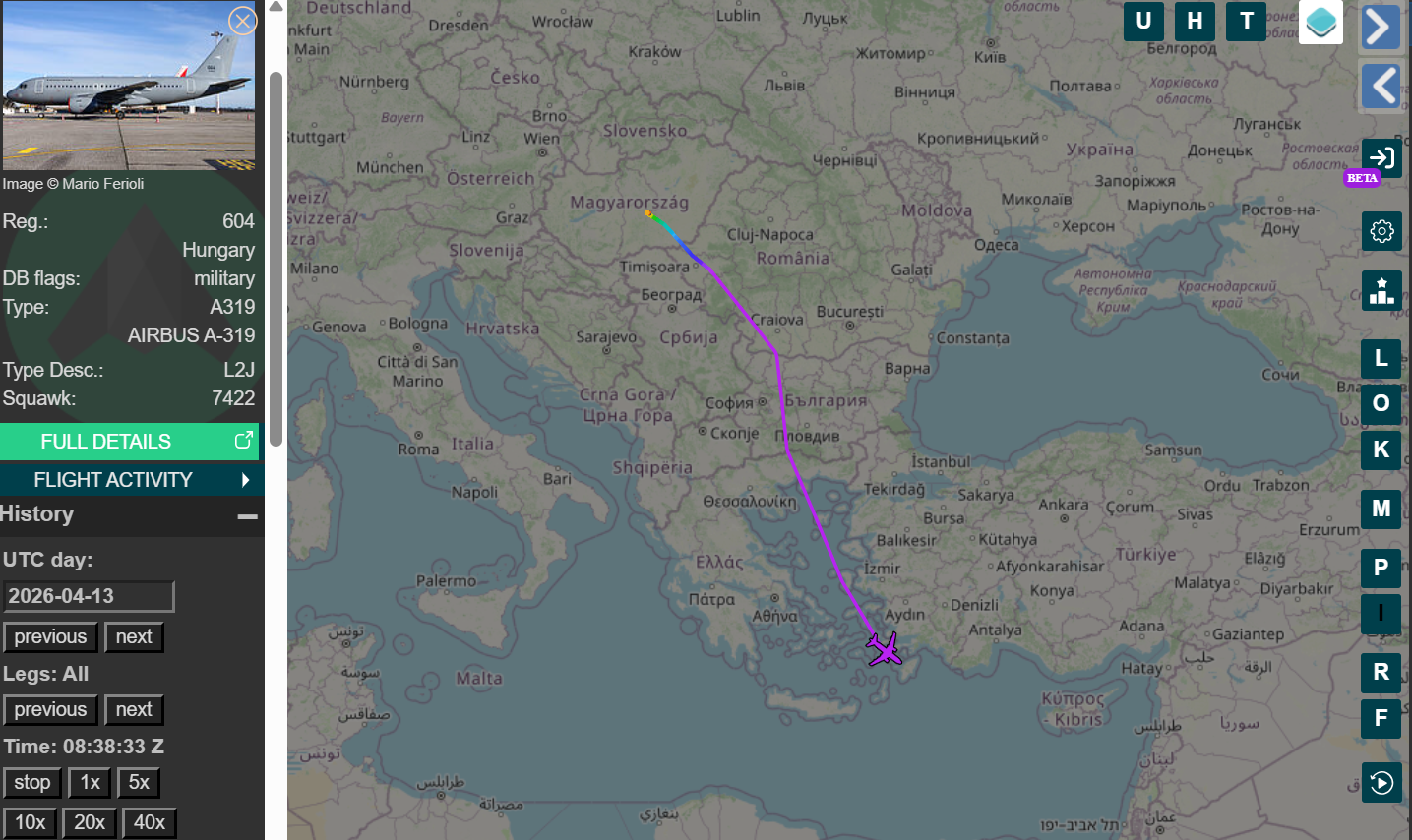 Szinte pontosan követi a 607-es Falcon útvonalát a honvédség egyik csapatszállító repülője, a 604-es lajstromjelet viselő Airbus A319-es is, ami itthoni idő szerint reggel 9-kor (UTC 07:00) indult el a kecskeméti katonai repülőtérről.