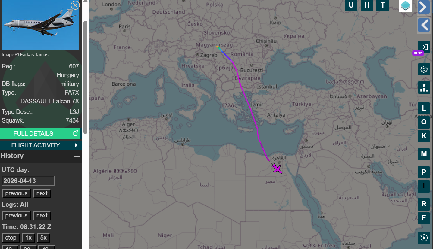Nagyjából ugyanakkor, amikor a 611-es hazafelé indult Líbiából, itthoni idő szerint reggel 8 után pár perccel (UTC 06:03) a kecskeméti katonai repülőtérről útra kelt Szijjártó Péter külügyminiszter egyik gyakran használt légi taxija, a 607-es lajstromjelű Falcon. Először dél-keletre, majd Románia felett délre fordult, és Egyiptom felé vette az irányt.