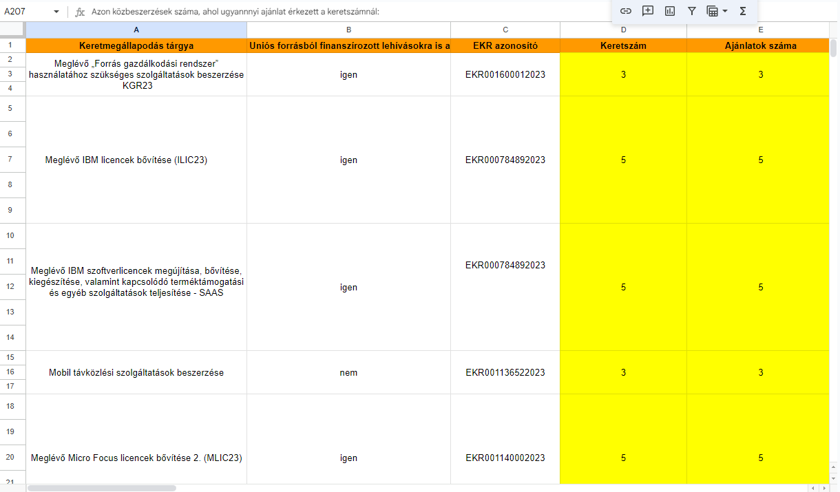 Az egyik az, hogy az általunk vizsgált 46 korábbi keretközbeszerzésből 28 esetében ugyanannyi vagy kevesebb ajánlat érkezett, mint a DKÜ által meghatározott keretszám. 21 esetben pedig pontosan ugyanannyi (!) ajánlatot adtak be, mint a keretszám (ezeket a tendereket citromsárga színnel jelöltük a táblázatban).