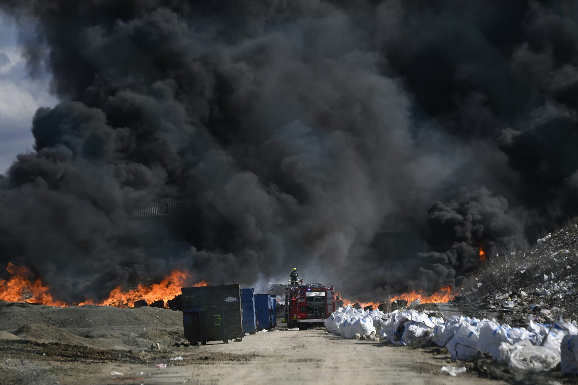 Gyál, 2023. március 28. – Lángokban áll egy hulladékfeldolgozó telep Gyálon 2023. március 28-án. Papírbálák gyulladtak ki, és az így keletkezett tűz átterjedt egy csarnok jellegű tárolóépületre, illetve egy betonsílóra, melyben feldolgozásra váró műanyagdarálékot tartottak. Több ezer négyzetméteres terület áll lángokban. MTI/Koszticsák Szilárd