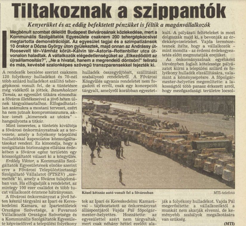 Ekkor dobta le az atombombát a Fővárosi Önkormányzat, amely pályázat útján egy kézbe adta volna a budapesti közszolgáltatást. A rendelettervezet óriási felzúdulást keltett a vállalkozások között, és azzal vádolták a Fővárost, hogy az FKF-re írták ki a pályázatot, mert a kritériumokat más nem tudta volna teljesíteni. A tervezet ellen 1997. március 8-án 120 szippantókocsi és több mint 70 szilárd hulladék-szállító autó demonstrált Budapesten, megbénítva a belváros forgalmát.
