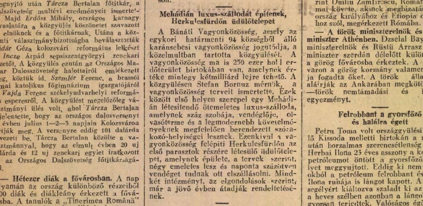 Egy évvel később a Brassói Lapok azt írta, hogy a Bánáti Vagyonközösség, amely az egykori határmenti 94 községből álló karánsebesi vagyonközösség jogutódja volt, közgyűlést tartott. Itt hangzott el, hogy a Herkulesfürdőn létesítendő ötemeletes luxus-szállodának száz szobája, vendéglője, olvasóterme és a legmodernebb követelményeknek megfelelően berendezett szórakozóhelyiségei lesznek.