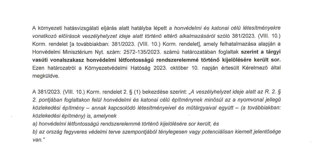 Az új környezeti hatásvizsgálati eljárás átkerült a Jász-Nagykun-Szolnok Vármegyei Kormányhivatalhoz, a civilek innen értesültek arról, hogy katonai célúvá minősítették a vasúti beruházást (forrás: 2023. októberi határozat)