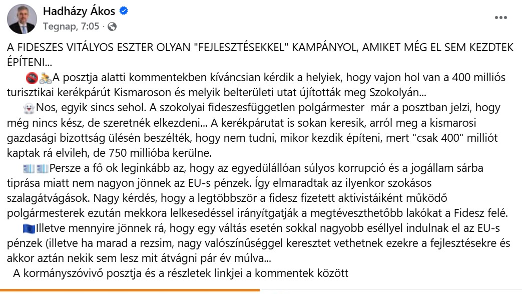 Azon Hadházy Ákos is felhördült, hogy Vitályos az idei kampányban Kismaroson befejezettnek jelentett be egy turisztikai kerékpárutat, amire 400 millió forintot költöttek. Ez nem létezik, csakúgy mint a szokolyai 150 millió forintos útfelújítás sem, amit Vitályos szintén felsorolt a kiemelt fejlesztések közt.