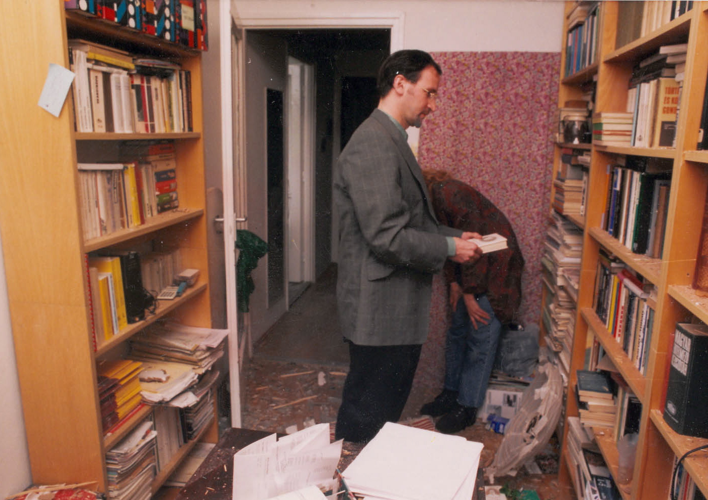 Szájer József lakásában 1998. május 2-án, miután május 1-jén éjjel lakása előtt, a XVI. kerület Futórózsa utca 81. számú ház második emeletén ismeretlen eredetű és összetételű bomba robbant. (fotó: MTI/Rózsahegyi Tibor)