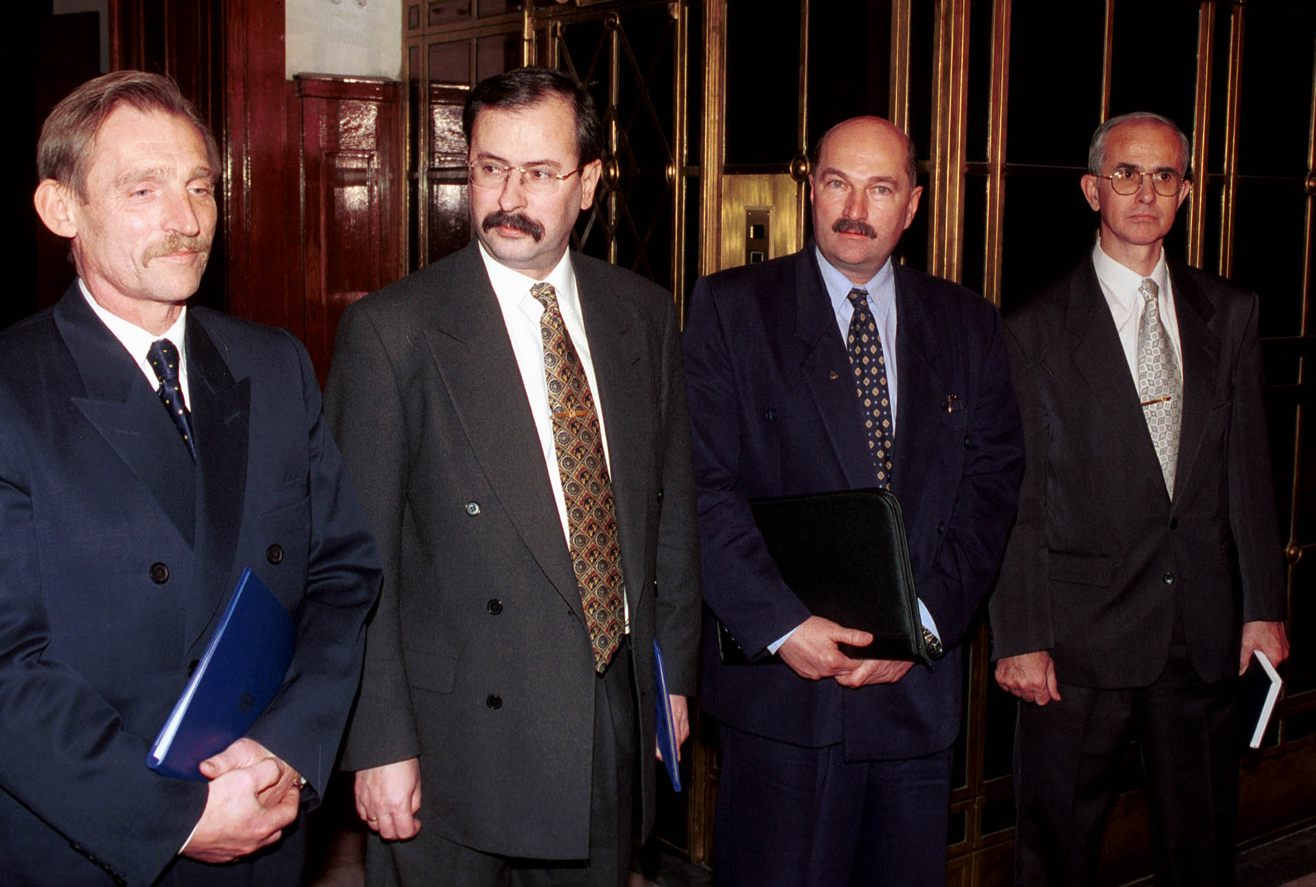 Pintér Sándor belügyminiszter (b), Demeter Ervin titkosszolgálatokat felügyelő tárca nélküli miniszter (b2), valamint Bácskai János, a Szervezett Bűnözés Elleni Koordinációs Központ főigazgatója és helyettese, Mikó István 2001. 01. 18-án. (Fotó: MTI/Rózsahegyi Tibor)